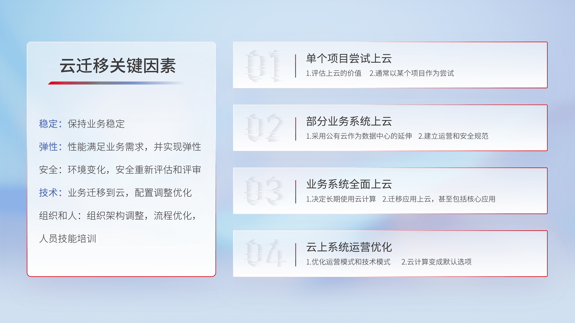 结合实际业务,,,从规划设计、、云平台选型、、云原生改造、、、、数据迁移、、、、集成交付,,,迁移全过程为客户识别最佳上云路径,,做好风险识别管理,,设计网络架构、、、身份权限、、、、安全审计合规、、、操作审计、、、日志审计、、监控告警策略、、、多站点容灾设计等,,,对云上基础设施进行整体规划,,,,提升IT治理水平,,,,以满足弹性、、高可用、、、、高性能的需求。。。。