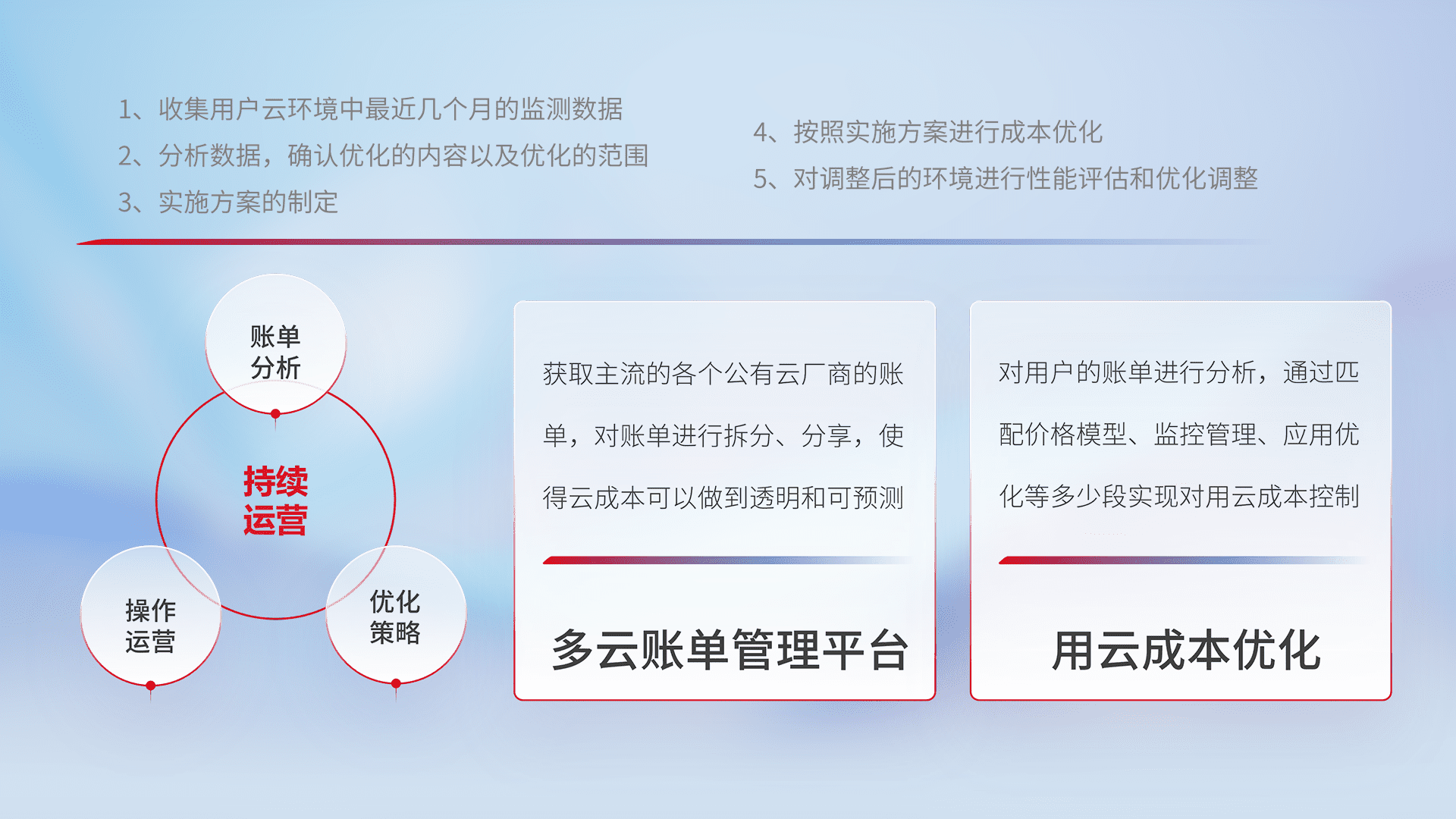 通过多云纳管,,,以统一的资源数据模型把客户的云资源进行抽象和封装,,,进而实现对多云资源的统一操作,,,保障云资源管理的可靠性、、、、稳定性与可用性。。量身定制化运维内容,,,,配置、、、开发运维、、、补丁管理、、、备份、、、、监控、、认证和访问管理、、、审计和日常巡检等,,,保障在用云过程中的可靠度,,,稳定度以及高可用率。。。